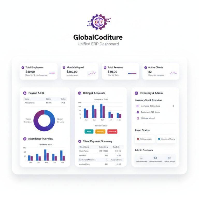 At GlobalCoditure, we don’t just build software — we build intelligent systems that empower businesses to operate smarter, faster, and more efficiently. Our ERP and automation solutions are designed to reduce manual workload, improve transparency, and enhance overall business performance.